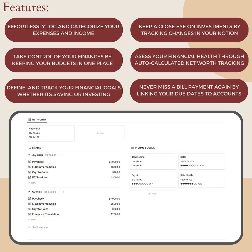 An all in one customizable Finance Tracker with auto-calculated account tracking for expenses, income, and subscriptions, giving you the power to stay on top of your financial goals.